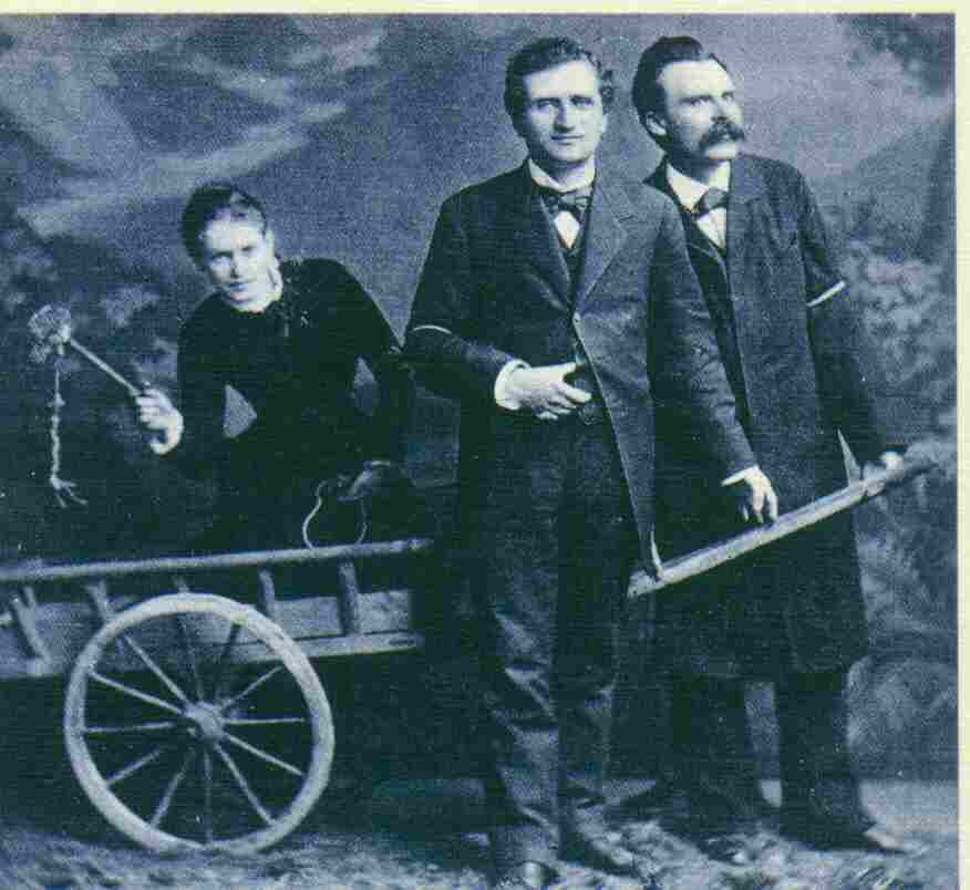 À droite, on remarque le grand Friedrich à moustaches avec le regard hagard ; au centre Paul Rée au regard béat ; à gauche Lou Andeas-Salomé au regard vicieux, et surtout, armée d’un redoutable fouet.